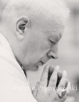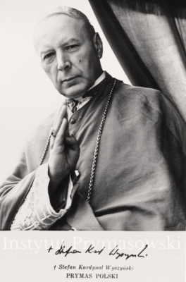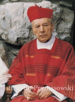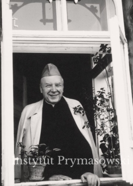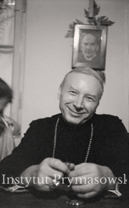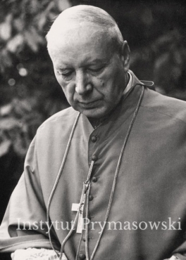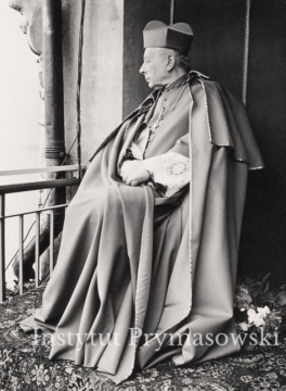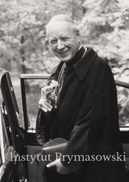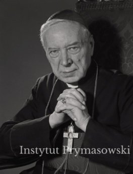 Zdjecie portretowe .Bp S.Wyszynski stoi.Postac do kolan. .Prawa reke opierta o oparcie krzesla.