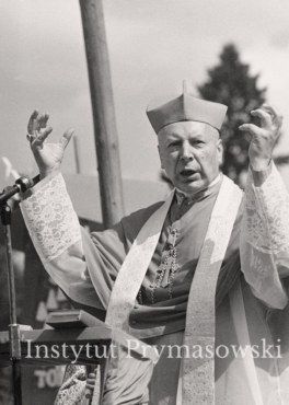 Na kleczniku prymas S.Wyszynski na jasnogorskim szczycie. Ponizej na placu, tlumy wiernych przybylych ns uroczystosci.