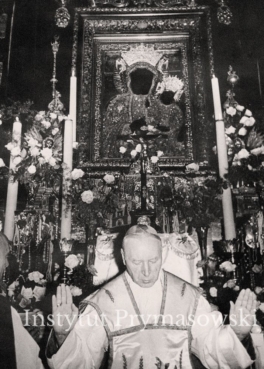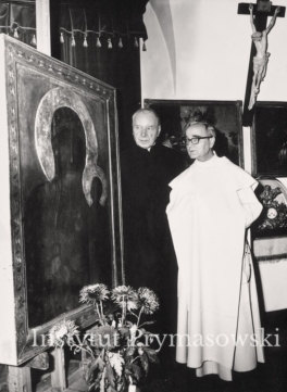 Ks. Prymas Stefan Wyszy?ski przy Cudownym Obrazie Matki Bo?ej w swoim mieszkaniu na Jasnej Górze; od lewej: o. gen. Jerzy Tomzi?ski, Janina Michalska i Maria ?Lilka? Wantowska.(Instytut)