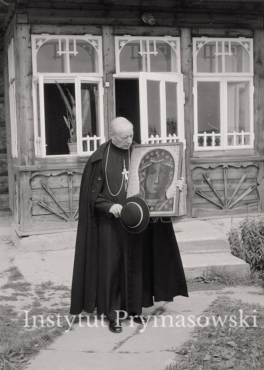 Kard.Stefan Wyszynski z obrazem "glowki" Matki Bozej. Jest to kopia oblicza M. B. Jasnogorskiej, namalowana przez prof. Torwirda w 1961r.na pietnastolecie konsekracji biskupiej kard. Stryszawa - wakacje, lipiec 1961r.