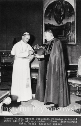 Na audiencji u Ojca ?wi?tego Paw?a VI. Od prawej: Ojciec ?w. Pawe? VI, ks. pra?. Hieronim Go?dziewicz, ks. pra?. Franciszek Borowiec, ks. Prymas Stefan Wyszy?ski.